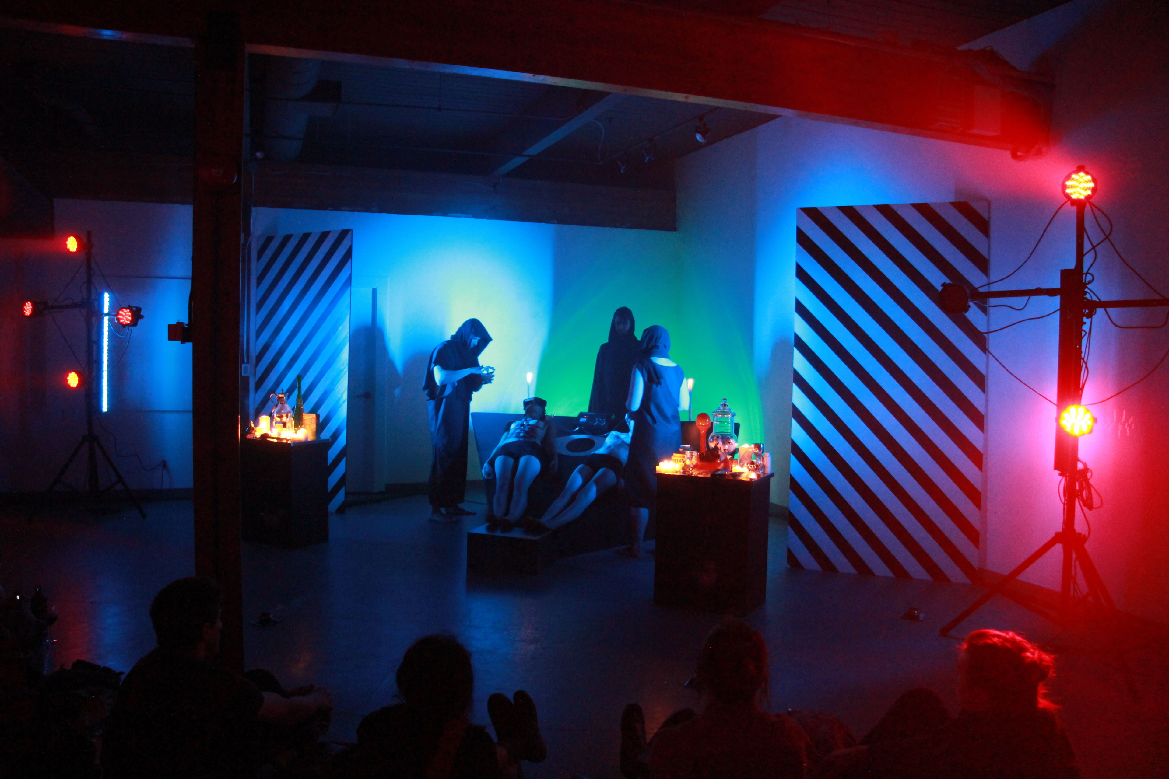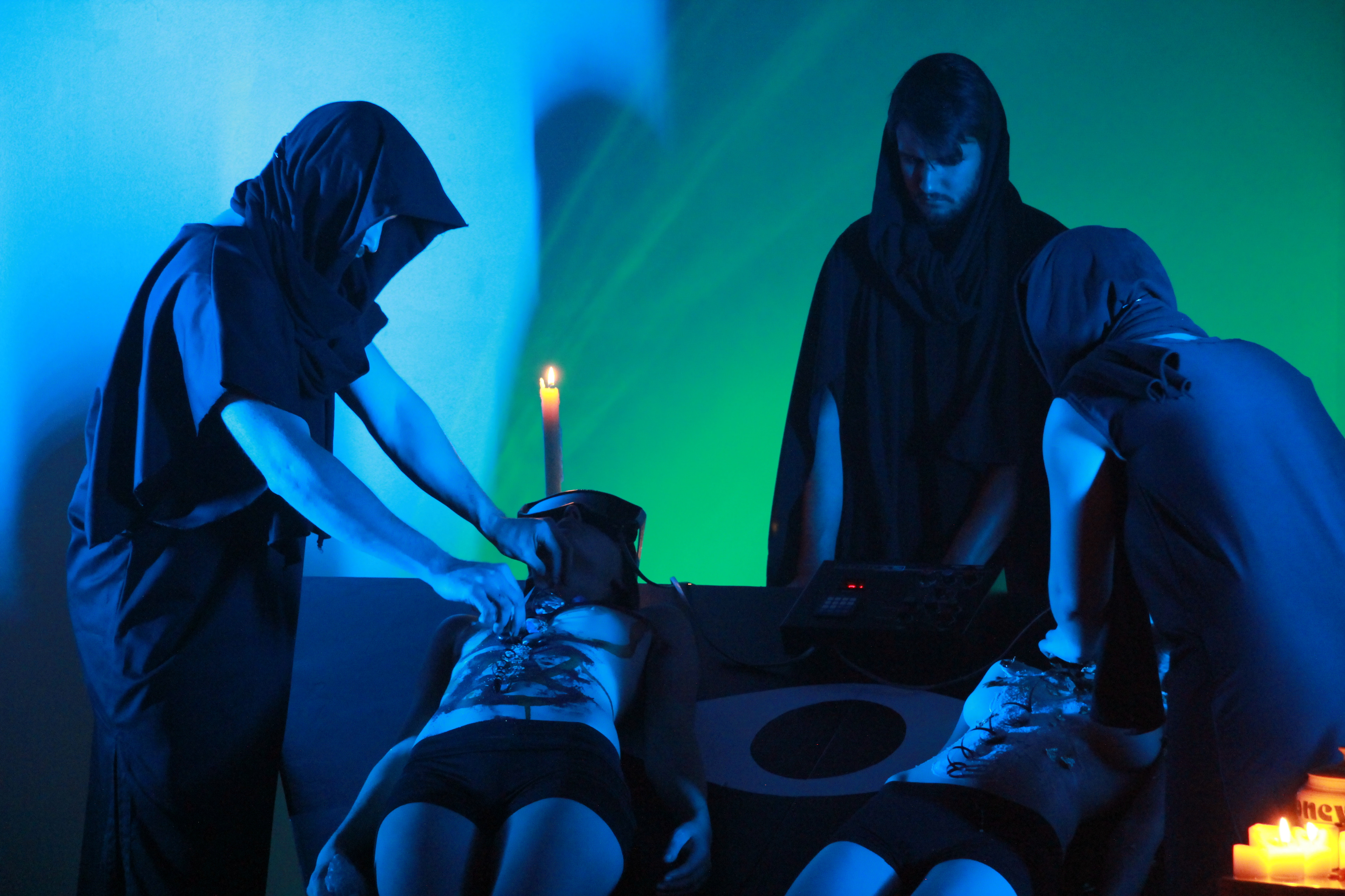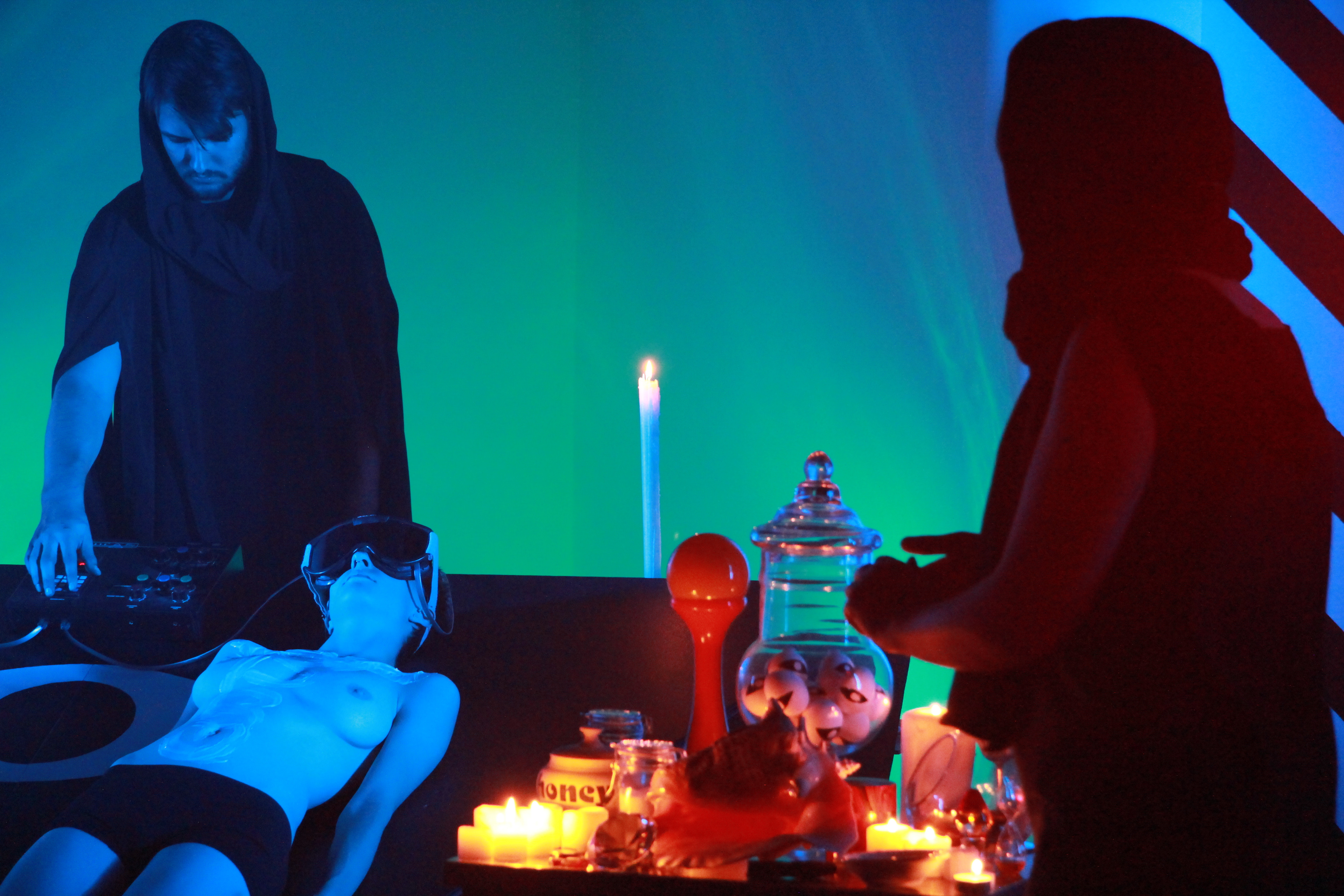 Turner Prize* extracts the dreams of various individuals using psychiatric equipment, meditation practices, cleansing rituals and incantations. The symbology and esoteric imagery of this information is distilled into visual manifestations of the dreamers’ psychological states. In Invocation of the Hidden Secret, this process is shared with an audience. It is both a theatrical re-staging of a dream ceremony and an exercise in producing a collective dreamstate among both performers and audience members.